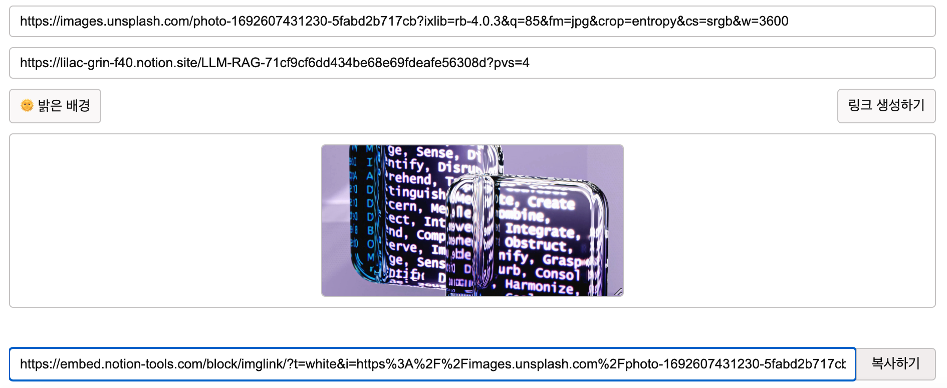 두 링크를 넣고 '링크 생성하기'를 클릭하면, 맨 아래 줄에 임베드 링크가 생성되고, 복사해서 사용하면 된다.
