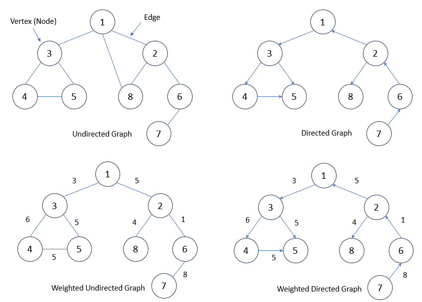 아래 그림에서 볼 수 있다시피, 화살표로 방향이 정해지는 방향 directed 그래프인지 여부, 노드간 거리에 가중치가 부여되는 weighted 그래프인지 여부에 따라 그 종류가 다양하다.
