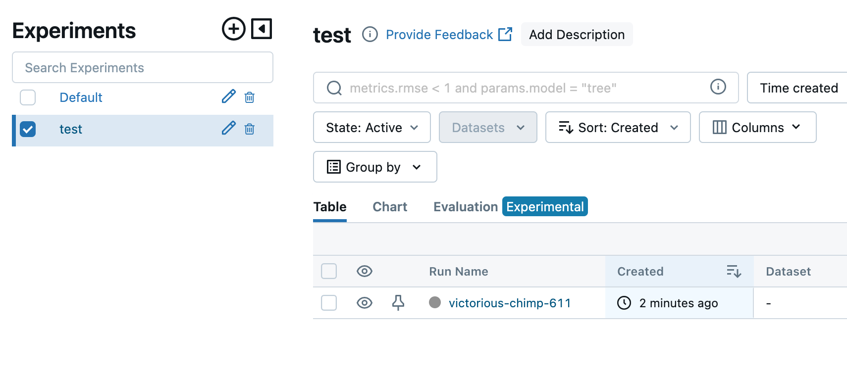 MLflow 화면에서 'test'라는 experiment가 생긴것을 확인할 수 있다.