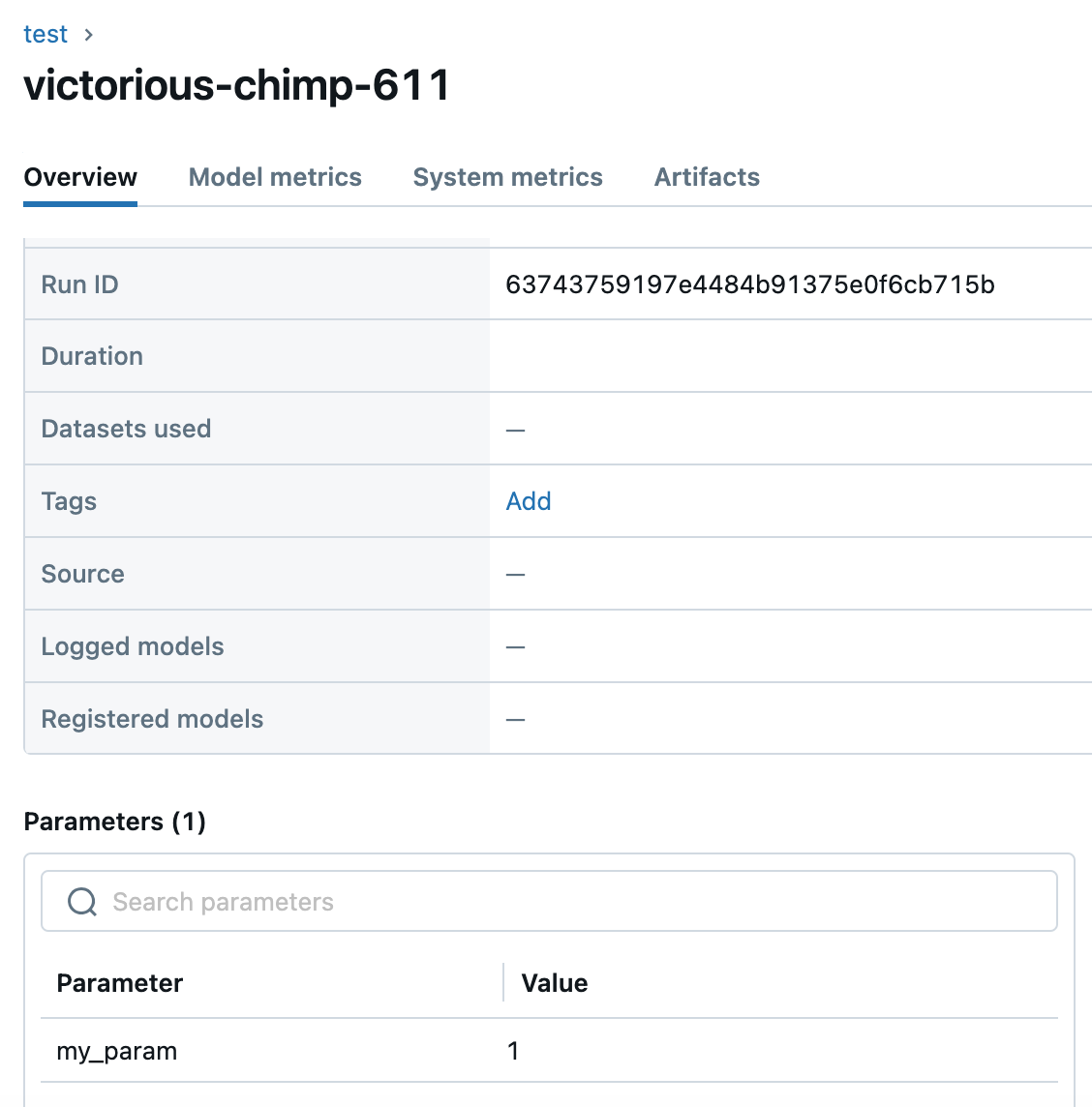 해당 run을 클릭하면 세부 정보에서 Parameter 정보인 1 값이 추가되었음을 확인 가능하다.