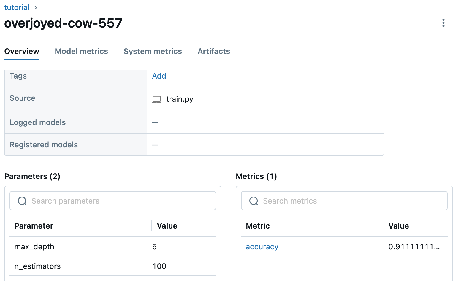 tutorial이라는 experiment 안에, parameters와 metrics가 각각 추가된 것을 볼 수 있다.