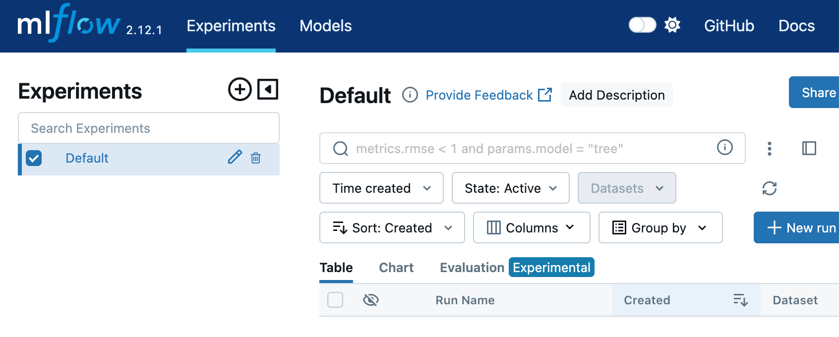 결과적으로, http://0.0.0.0:5001/ 에 접속해보면, mlflow 서버가 실행됨을 확인할 수 있다.
