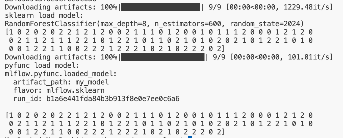 그 결과 sklearn model , pyfunc model 의 방식으로 각각 모델이 불러와지고 예측한 값을 확인할 수 있다.