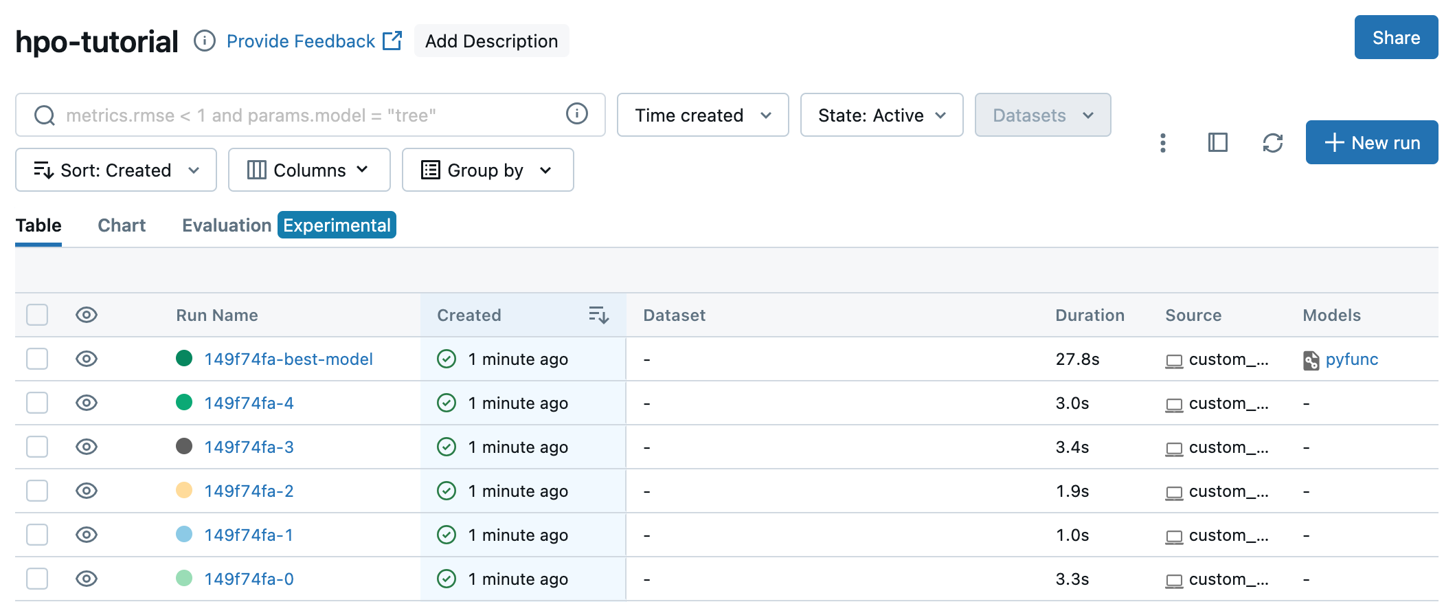 MLflow 사이트 (0.0.0.0:5001)에 가보면, hpo-tutorial 실험에 5개의 모델과,