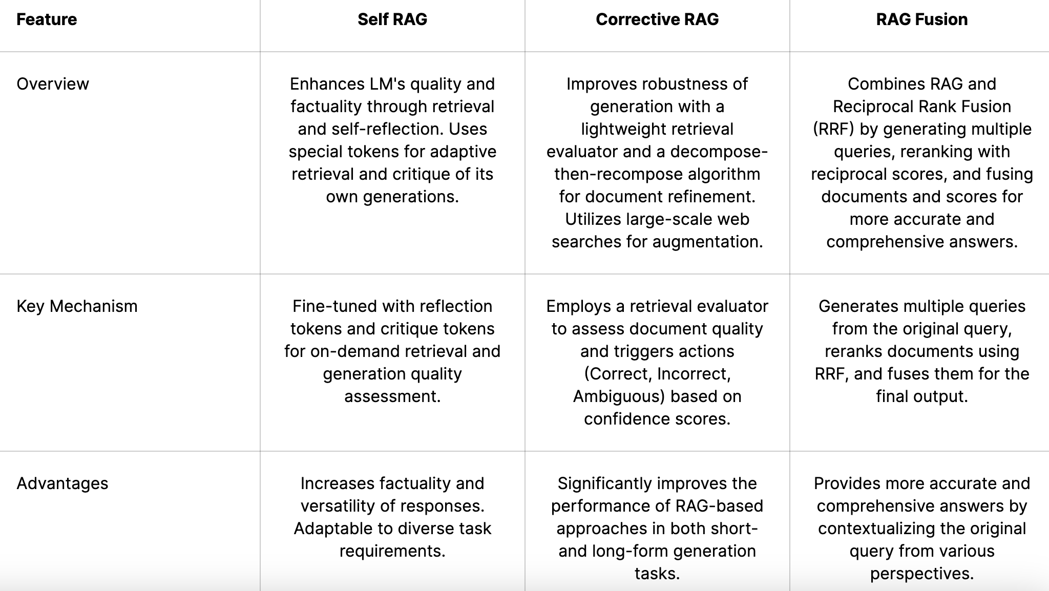 - A. RAG Fusion : RAG와 상호 랭크 융합(RRF)을 결합하여, 여러 쿼리를 생성하고 상호 점수로 재랭킹, 문서와 점수를 융합하여 더 정확하고 포괄적인 답변을 제공