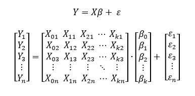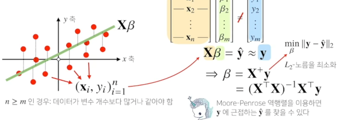 연립방정식 수식에서 Ax = b라는 식이 성립했다면, 선형 모델에서는 X β = y 로, X와 y가 주어진 상황에서 계수 β 를 구해야 한다.