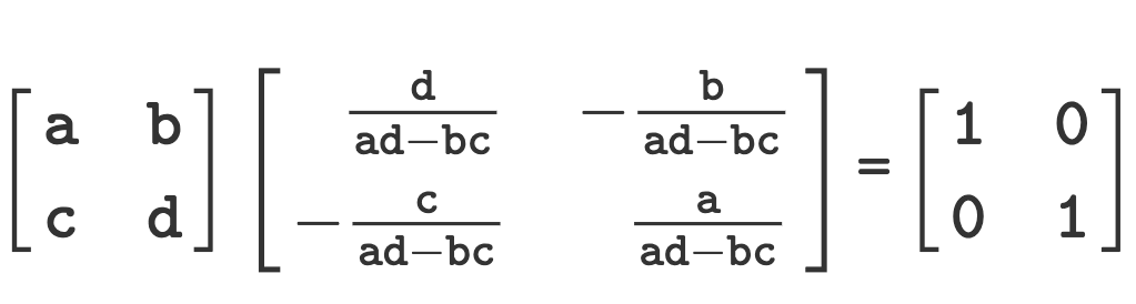 행렬 A와 A의 역행렬을 곱하면 항등행렬이 된다. (항등행렬 : 임의의 벡터를 곱했을때 자기 자신이 나오는 행렬)