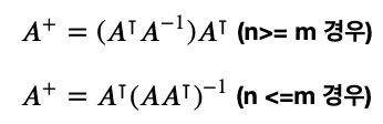 - n <= m인 경우, (열이 행보다 클 때) 행렬(A)을 유사역행렬(A+) 보다 더 먼저 곱해줘야 한다.