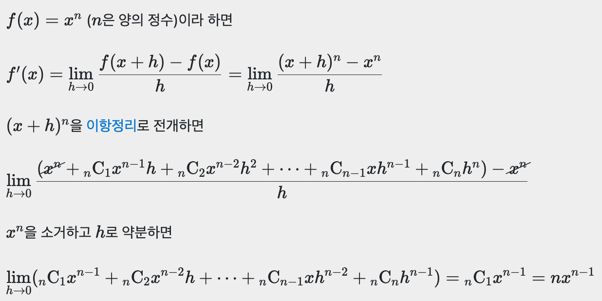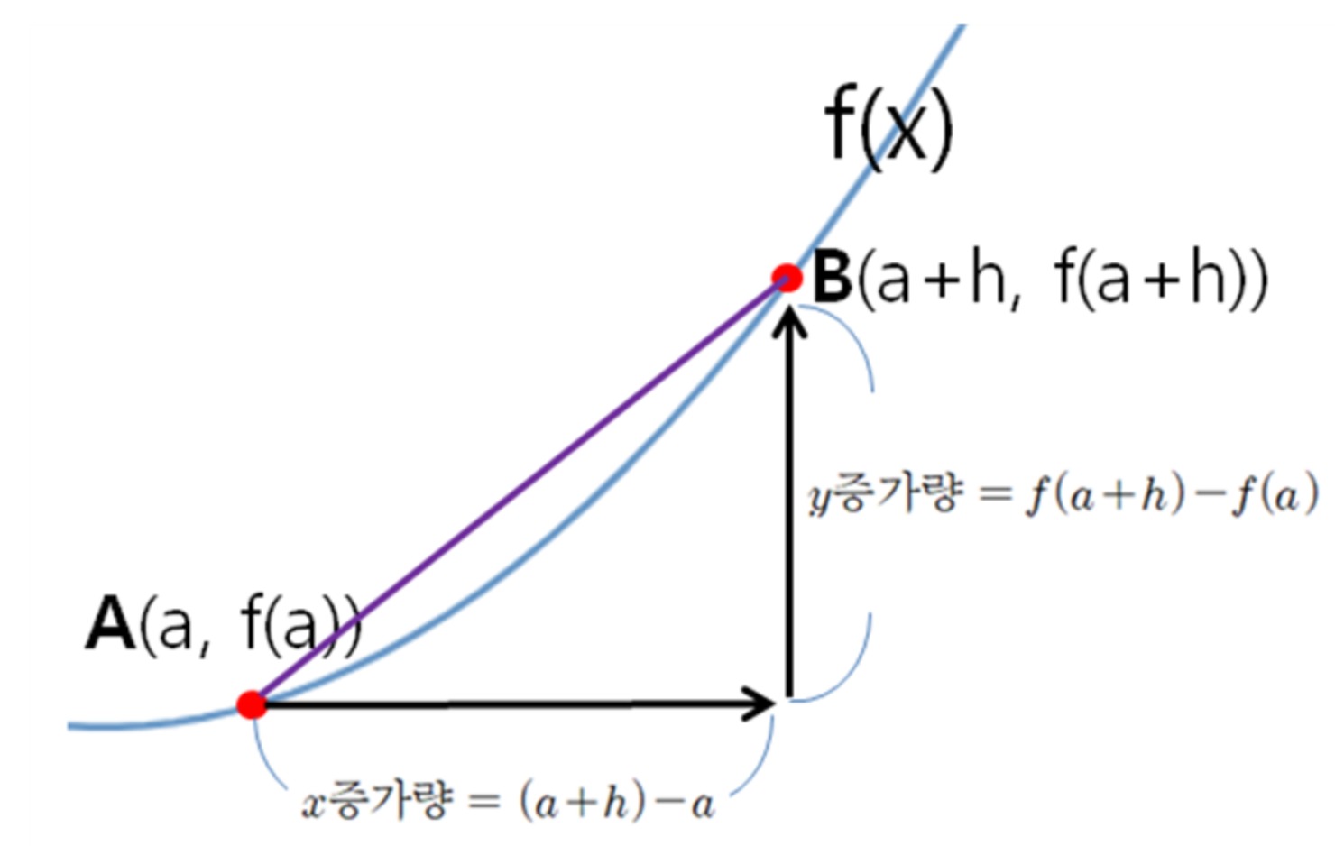 미분은 변화율의 극한으로 정의하는데, 어떤 기울기를 계산할때, f(x+h) - f(x)를 h로 나눈 것, 이 변화율의 극한값이 미분이다.
