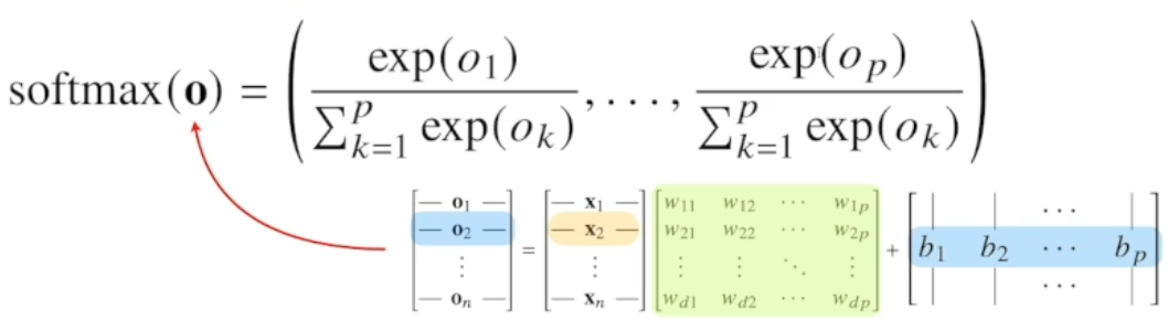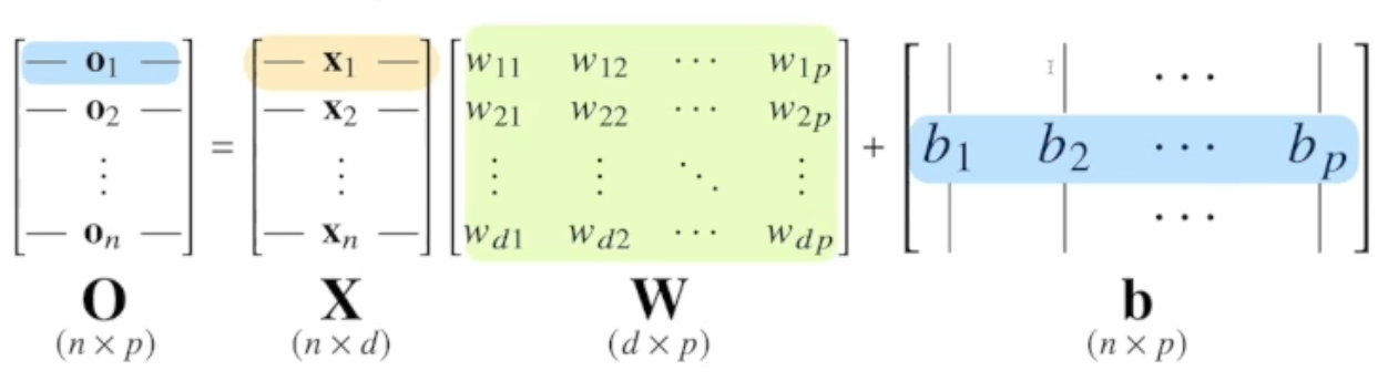 오른쪽 그림에서 각 행벡터 Oi는 데이터 xi와 가중치 행렬 W사이의 행렬곱 + 절편 벡터 b의 합으로 표현된다.