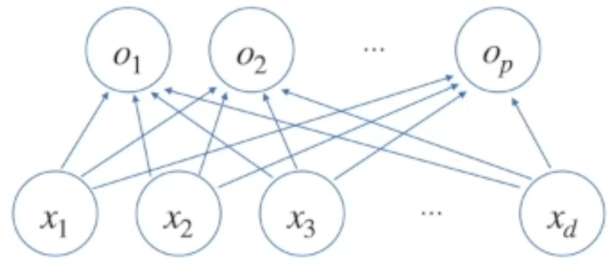 ==x변수들을 o개의 선형 모델로, p개 만들기. 이때 화살표의 개수는 p*d (W가중치 행렬의 원소의 개수)와 같다.