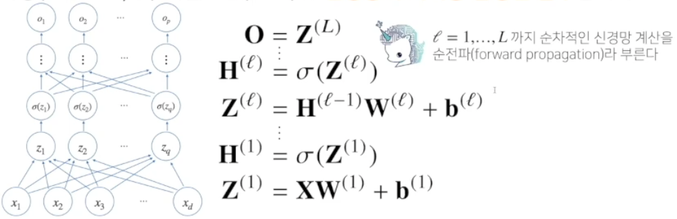 MLP에서, 입력데이터를 신경망에 통과시키며 순서대로 출력을 계산하는 과정이 순전파 (Forward Propagation),