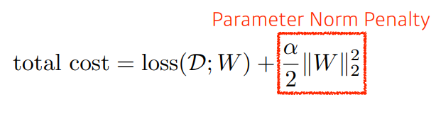 Parameter norm penalty는 뉴럴 네트워크 파라미터가 너무 커지지 않도록, 가중치(weight)를 제한하여 과적합을 방지하는 기법이다.